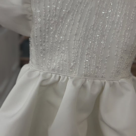 A customer favourite, this modern yet classic gown made from luxury Mikado fabric features puff sleeves and beading detail on bodice.