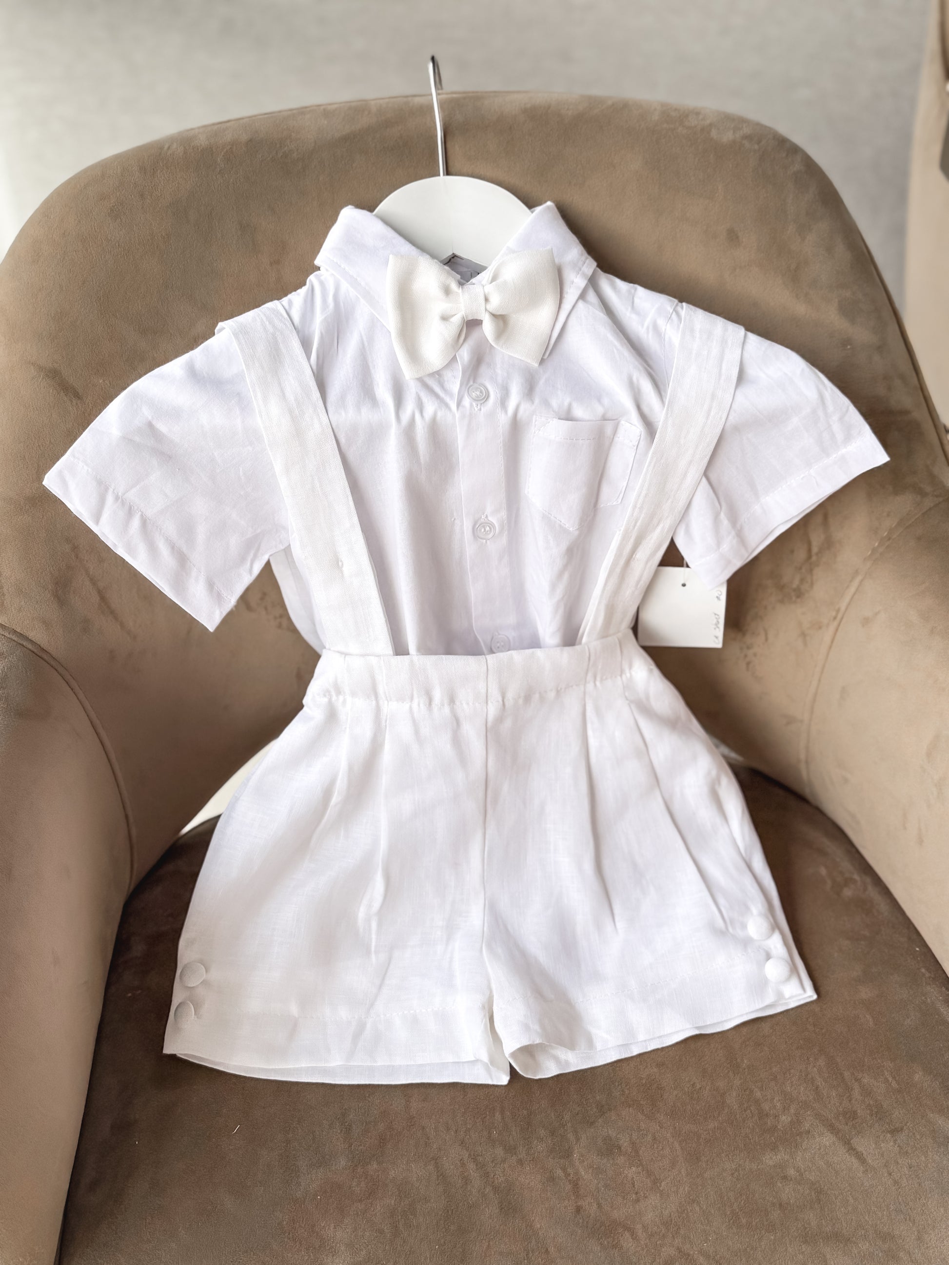 Crafted with care, the shorts and bow tie are made from soft linen, while the romper shirt is 100% cotton for breathable comfort. Each set also includes a matching cap to complete the timeless look.