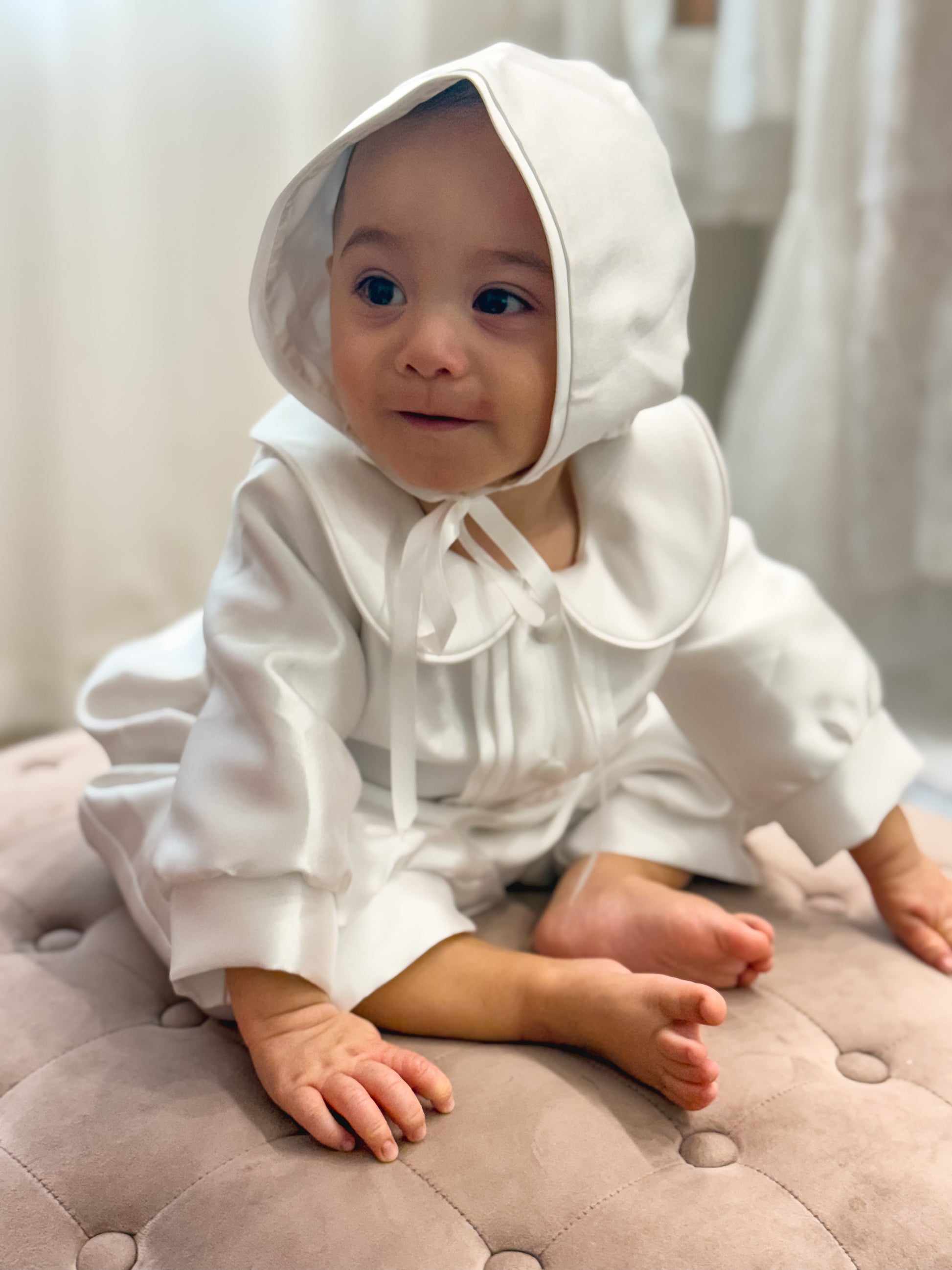 The Leon Mikado Christening Romper is modern yet timeless! Made from luxurious mikado fabric, this romper includes a matching bonnet and shoes for a complete look.