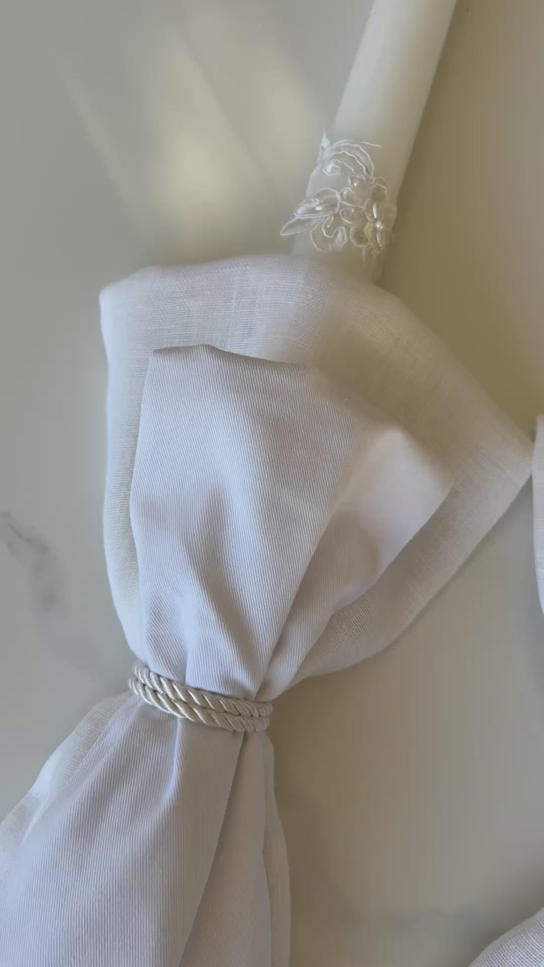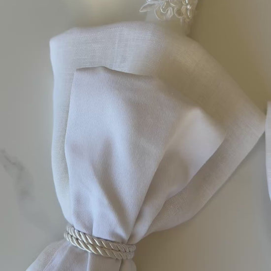 Our lace candle is all about the detail! Wrapped in luxurious bridal lace, with your choice of a white satin bow for a classic look or sewn fabric sashes (using a blend of linen and cotton fabrics) for a modern look.