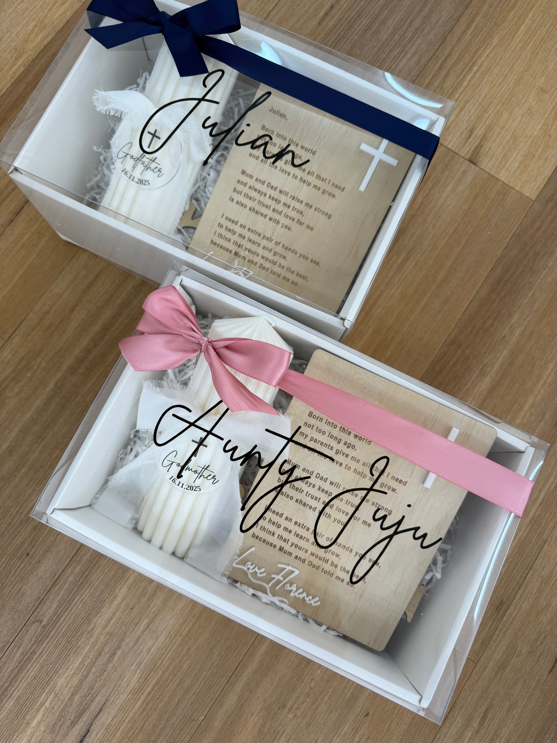 Our personalised gift boxes feature a clear lid and satin ribbon bow.